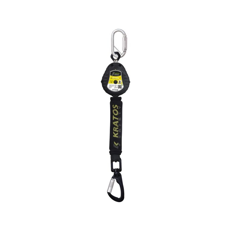 Boîtier en polymère haute résistance compact et léger. Fenêtre pour le contrôle visuel des composants internes, sans ouverture complète du boîtier. Sangle en aramide large de 21 mm avec : - 1 connecteur acier double action ¼ de tour avec barrette de sécurité, ouverture 18 mm, - 1 connecteur aluminium double action ¼ de tour avec émerillon. Avec absorbeur d'énergie protégé par une gaine textile. Système frein intégré. Pour utilisateur de maxi 140 kg en utilisation verticale et pour l'utilisation sur nacelle (double arête vive). Longueur : 1,75 m Poids : 0,77 kg Norme : CE Cat III - EN 360 - DIN 19427