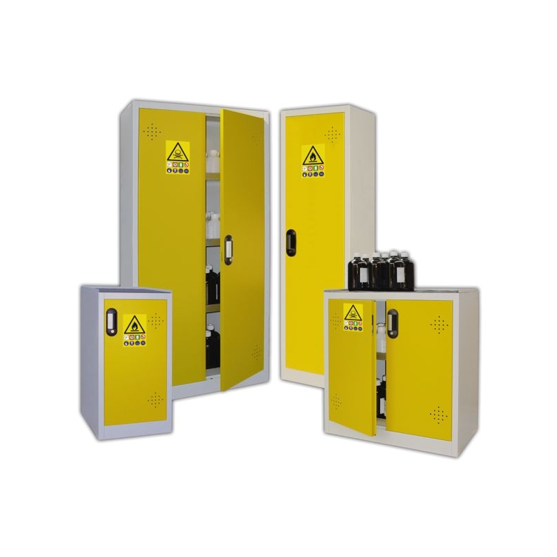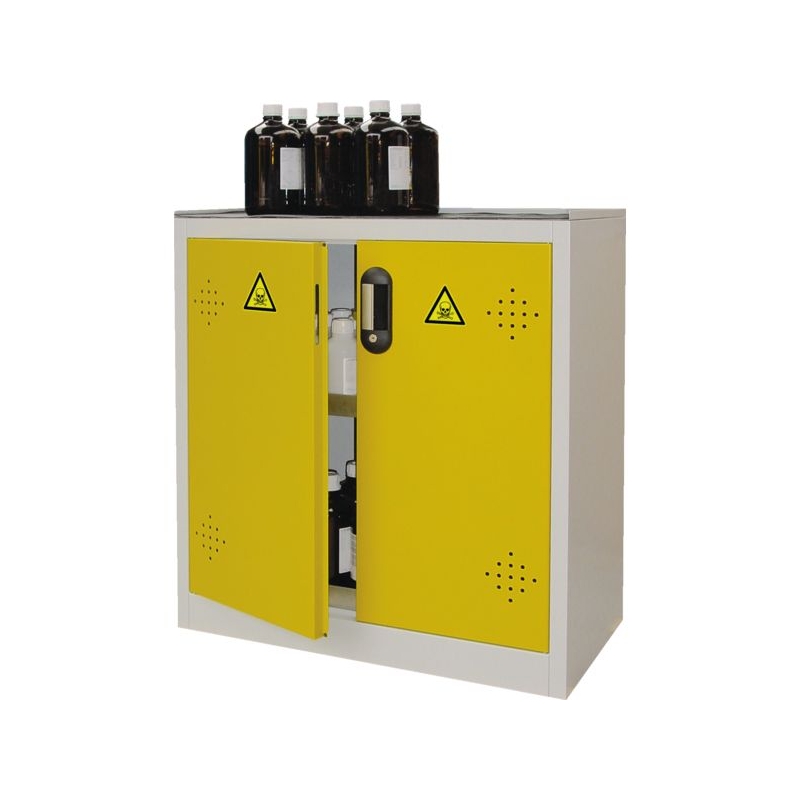 En acier monobloc avec portes battantes à 110°. Solution économique pour le stockage de produits dangereux en toute sécurité et en conformité avec la législation. Fournie avec pictogrammes normalisés : Corrosifs , Toxiques et Inflammables (à apposer selon utilisation). Orifices de ventilation haut et bas au niveau des portes. Fermeture à clé en 3 points. Étagères et bacs de rétention réglables en hauteur sur crémaillères, au pas de 15 mm. Armoire haute à 4 étagères ou basse à 2 étagères. Plan de travail des armoires comptoirs recouvert par un tapis en caoutchouc. Conformes aux articles R5132-66 et R5132-68 du Code de la Santé Publique. Conformes aux recommandations de l'INRS. Charge admissible par étagère : 80 kg UR Coloris : corps gris et portes jaunes Existe avec portes rouges, bleues et vertes, nous consulter.