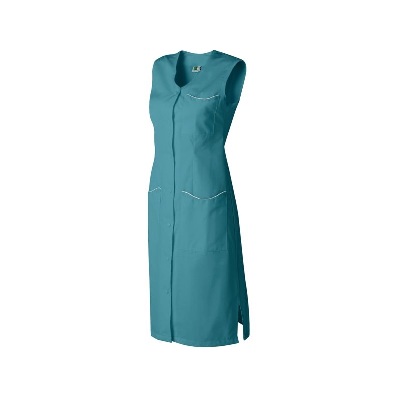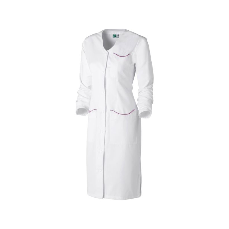65% polyester 35% coton, 210 g/m². Sans col. 1 poche poitrine, 2 poches basses. Fentes côtés, fermeture centrale par 7 pressions. Longueur : 105 cm Coloris : blanc, parme, rose, vert anis, gris perle Taille : 0 à 6 Norme : CE Cat II - EN 15797