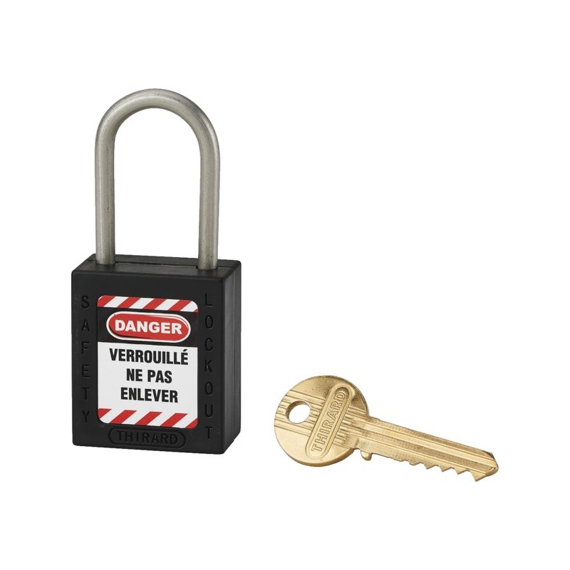 Corps ABS non conducteur avec anse en acier inoxydable. Double ancrage. Fonction clé prisonnière. Livré avec 1 clé. Fonction clé prisonnière. Environnement ATEX. Dimensions corps (L x H) : 38 x 44 mm