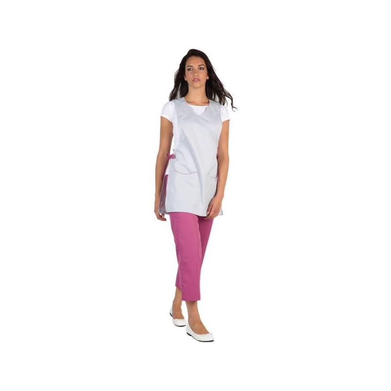 65% polyester 35% coton, 210 g/m². 2 poches basses, fermeture côtés par lacets, fentes côtés. Longueur : 75 cm Coloris : blanc, gris perle, parme, rosa, vert anis Taille : 1 (PT), 3 (GT) Norme : CE Cat II - EN 15797