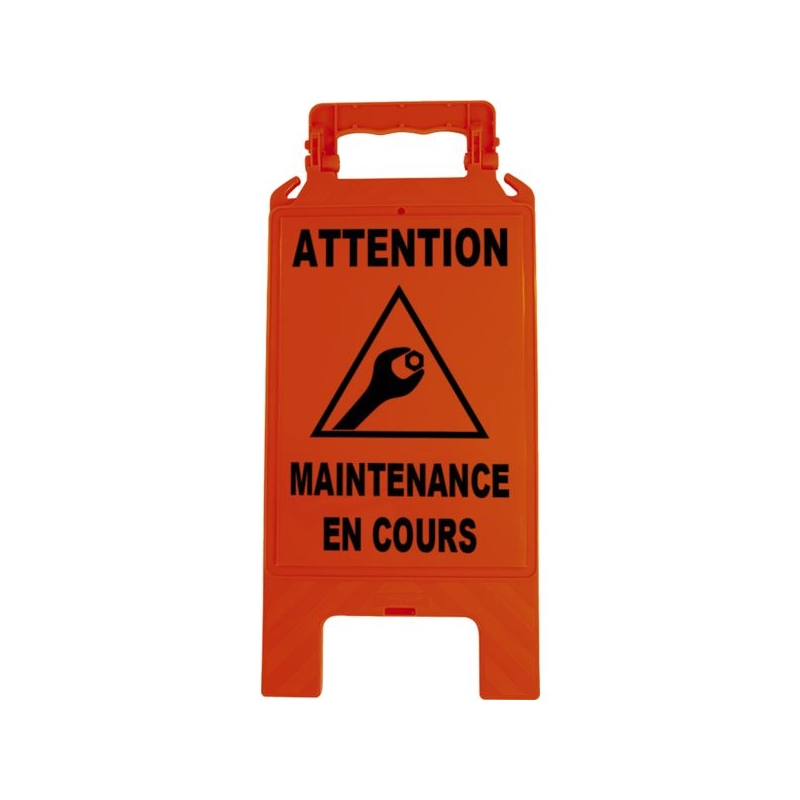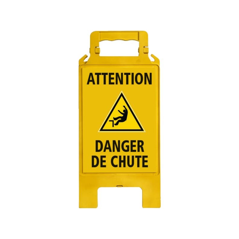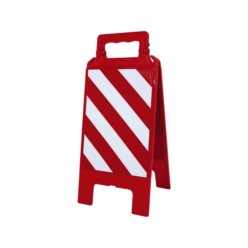 En polypropylène avec renforts de maintien. Utilisation temporaire intérieure et extérieure. Poignée ergonomique, large surface d'impression. Clip de maintien en position ouverte, grande stabilité. Crochets pour chaîne de signalisation. Dimensions (H x l) : 600 x 275 mm Épaisseur (plié) : 23 mm