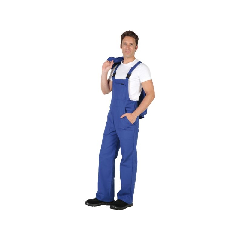 100% coton - Croisé, 320 g/m². Traité antiretrait. Fermeture côtés par boutons, braguette boutons. Bretelles élastique dans le dos et boucles plastique réglables. Poche bavette zip injecté avec compartiment stylo, 2 poches basses et 1 poche dos fermée par boutons. Entrejambe : 82 cm Coloris : blanc, bleu bugatti Taille : 0 à 6