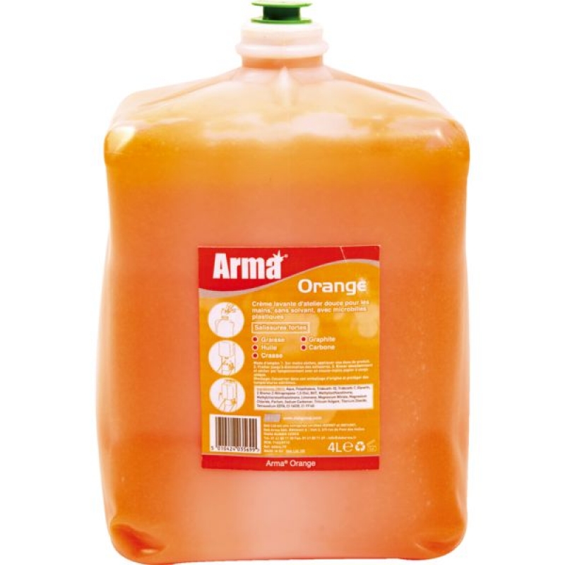 Pour salissures fortes. Crème lavante d'atelier pour les mains, douce et sans solvant, avec charges végétales, efficace contre les salissures fortes. Conditionnement : bidon pompe de 4 l