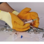 Enduction 3/4 latex naturel. Finition crêpée. Support tricoté en fibres polyester, sans couture, jauge 7. Protection antipiqûres dans la paume de la main et le bout des doigts. 6 couches de protection. Dos aéré, poignet tricot. Environnement : humide, mouillé, sec Applications métiers : déchets et recyclage, traitement des déchets dans les centres hospitaliers, blanchisseries, traitement des eaux usées, nettoyage municipal, applications où une grande sécurité est requise contre les aiguilles et les arêtes très coupantes Taille : 7 (S) à 10 (XL) Norme : CE Cat II - EN 388 (4X43F)