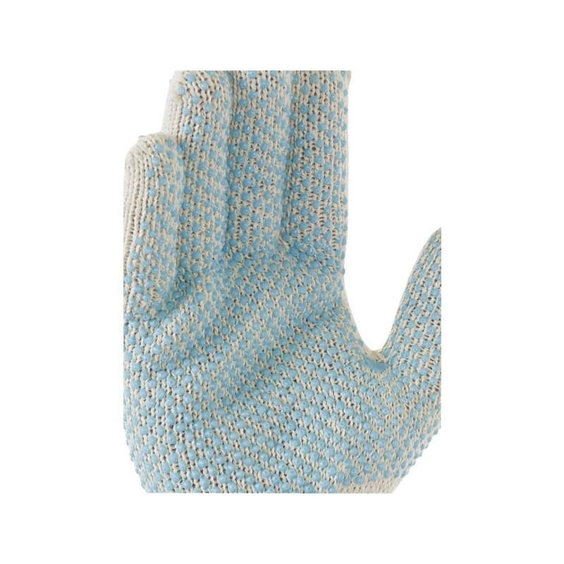 Picots PVC sur la paume et le dos. Tricoté sans couture, en polyester/coton, jauge 7. Poignet élastique, ambidextre. Environnement : sec Applications métiers : entreposage, stockage, bricolage, manutention Taille : homme (H), femme (F) Norme : CE Cat II - EN 388 (1121X)