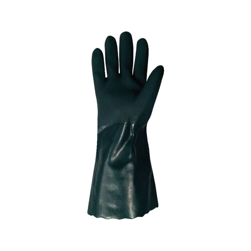 PVC double couche. Finition sablée. Support en coton. Manchette finition en crispin. Anatomique. Traitement antibactérien Sanitized®. Environnement : chimique, huileux, humide, sec Applications métiers : nettoyage industriel, industrie chimique, raffinerie, agriculture, entretien industriel, dérivés du pétrole, manipulation d’éléments abrasifs en milieux acides, graisseux ou pétroliers Épaisseur : 1.50 mm Longueur : 35 cm Taille : 9 (L) à 10 (XL) Norme : CE Cat III - EN 388 (4121X) - EN 374-1 type A (JKLMPST) - EN 374-5