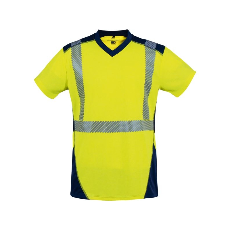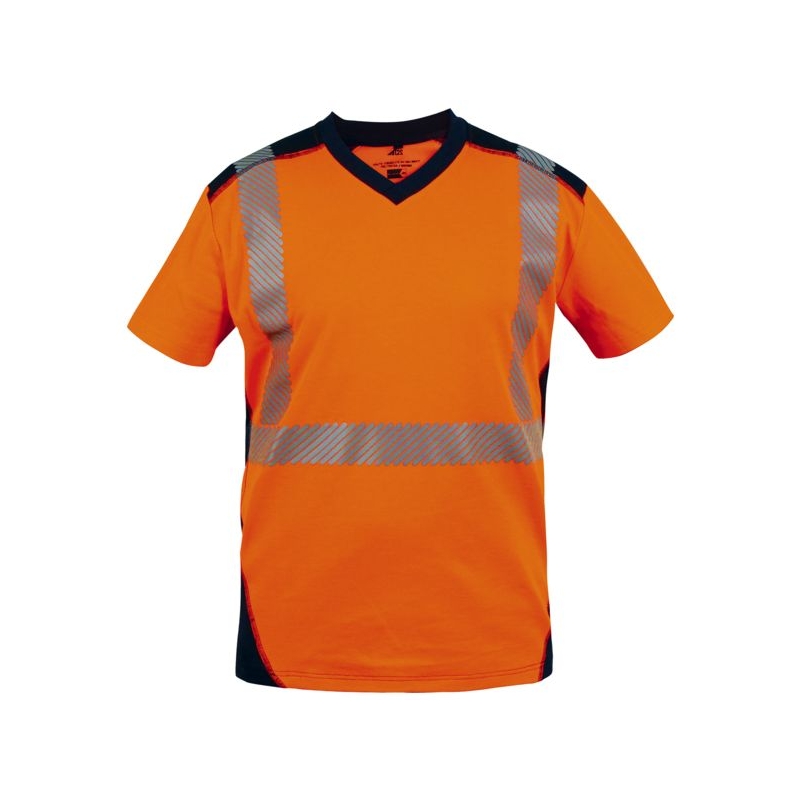 55% coton 45% polyester – Maille piquée double face, 180 g/m². Bandes rétroréfléchissantes segmentées - respirantes, extensibles et légères (50 cycles de lavage à 60° C). La segmentation de la bande permet l’évacuation de la transpiration et optimise le confort par forte chaleur. Coutures plates anti-irritations, col en V, emmanchures, bas de manches et base sur les côtés en tissu maille, 115 g/m², ultra respirant en coloris contrastant. Manches courtes. Entretien : lavage ménager (certifié 50 lavages) Protection contre les rayons UV : UPF 40+ Coloris : jaune fluo/marine, orange fluo/marine Taille : S à 3XL Norme : CE Cat II - EN ISO 20471 (2) - EN 13758-2