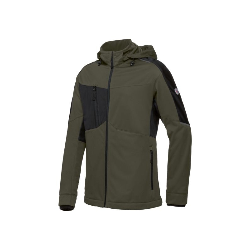Softshell, 100% polyester 240 g/m² + membrane 100% PU. Col officier, fermeture à glissière sur le devant avec protège-menton en polaire. 1 poche poitrine et 2 poches latérales avec fermeture à glissière, poignets coupe-vent. Grande liberté de mouvement grâce aux empiècements extensibles sous les aisselles. Bas réglable de l'intérieur, éléments réfléchissants. Capuche détachable par zip et réglable en largeur. Entretien : lavage ménager Coloris : olive/noir, noir/noir, gris anthracite/noir, marine/noir, marron/noir Taille : XS à 4XL