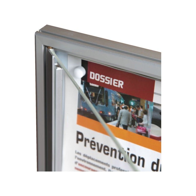 Porte battante, fermeture par serrure à clé avec pose à droite. Profil alu anodisé naturel, façade plexiglass avec entourage à partir du formats 6 feuilles. Fond tôle blanc pour affichage magnétique. Fixation murale 4 points. Absence d'entourage de porte pour le format 4 feuilles. Épaisseur hors-tout : 20 mm Épaisseur utile : 12 mm